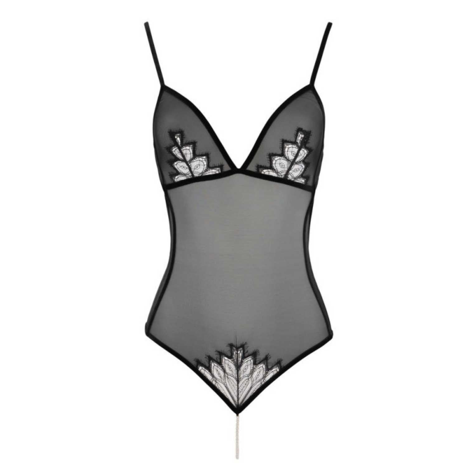 Das Perlen Body hat einen sexy tief geschnittenen Rücken mit einem BH Verschuß und schmiegt sich dank des elastischem Tüll und der Leavers spitze sehr angenehm an den Körper. Die elastischen Samtabschlüsse sind sehr edel und der Tüll hat eine sehr verführerische Transparenz. Die hochwertige Leavers-Spitze im Vorderteil gibt diesem noch den leicht romantischen Look. Für deine reizvolle Stimulation sorgt die Kette aus echten Manacor-Perlen im Schritt. Dein sichtbares Gesäß wird durch die schmalen Samtbänder auf verführerische Art betont. Um deiner individuellen Anatomie gerecht zu werden kann die Bundweite im Rücken reguliert werden und passt sich somit perfekt an.
