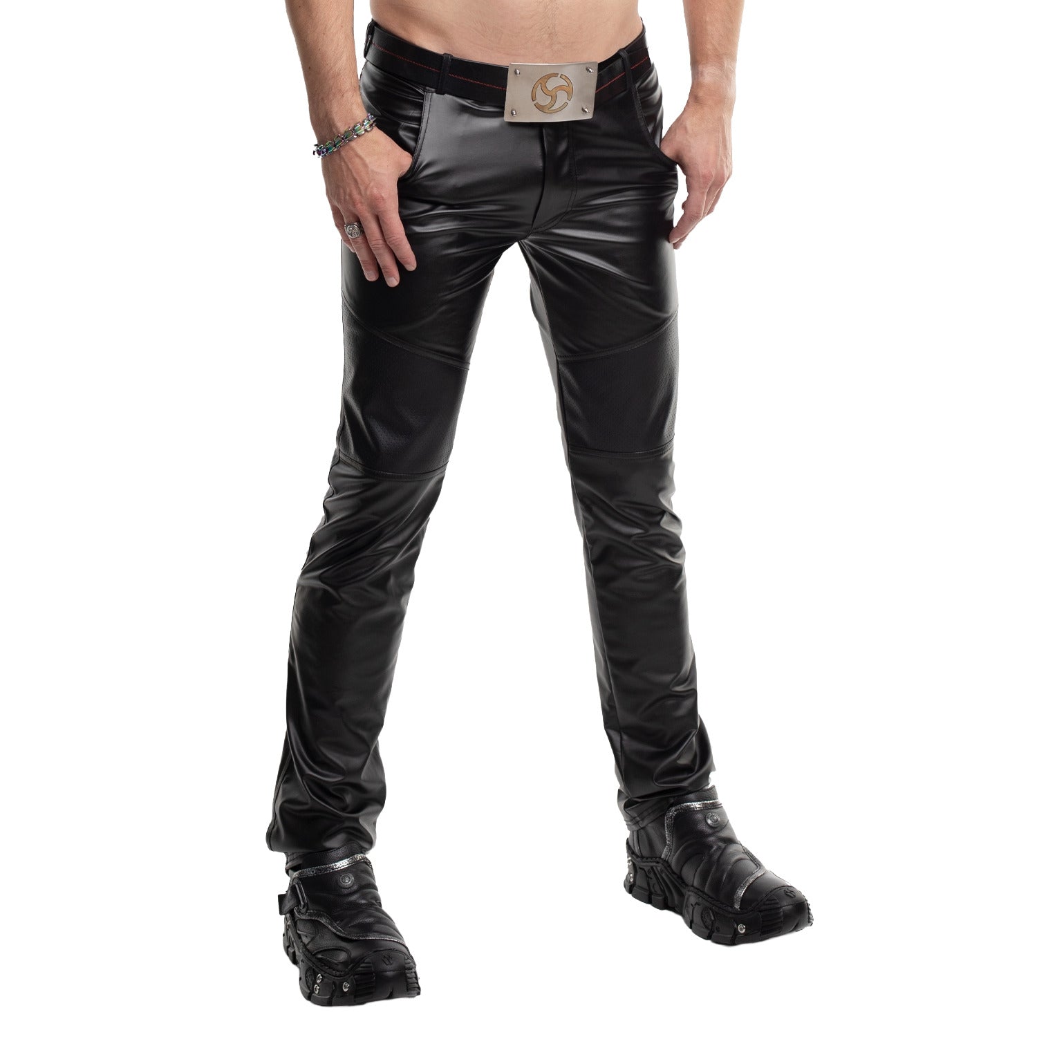 Mit dieser klassischen Low-Waist-Hose setzt Du ein starkes Fashion-Statement. Der elastische Wetlook-Stoff in tiefem Schwarz sorgt für eine figurbetonte Passform und verleiht Dir einen charakterstarken, modernen Look. Besondere Hingucker sind die perforierten Einsätze an den Oberschenkeln: Sie brechen das Design markant auf und ziehen garantiert die Aufmerksamkeit auf sich.