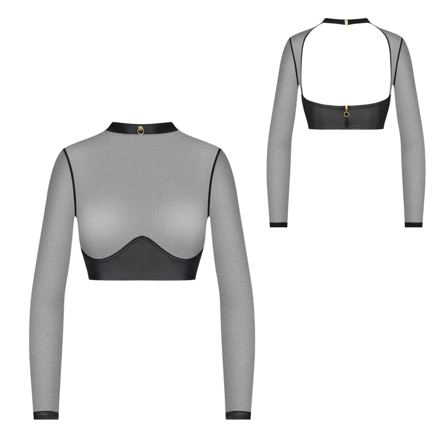 Langärmeliges cropped Top in doppelter Optik: mattes Leder und transparenter Tüll. Grafische Ausschnitte aus Tüll, die die Brust betonen. Der sexy Rückenausschnitt wird am Hals mit einem Haken und in der Mitte mit Reißverschluss geschlossen. Das Band unterhalb der Brüste sorgt für den perfekten Halt. Die Armabschlüsse sind in matter Lederoptik.