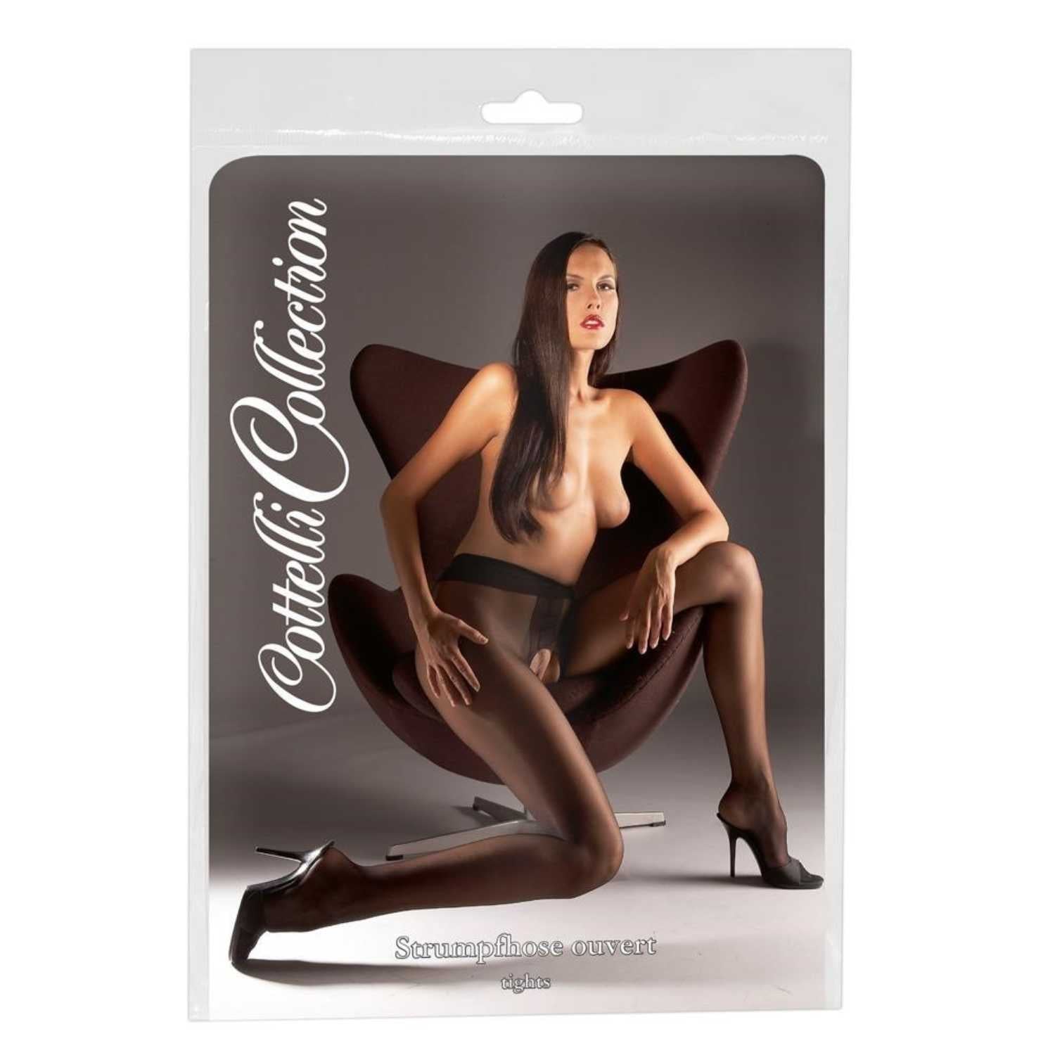 Seidig glänzende Straps-Strumpfhose mit einladend offenem Schritt. Das Höschenteil ist in blickdichter String-Optik gehalten. 20 Den.